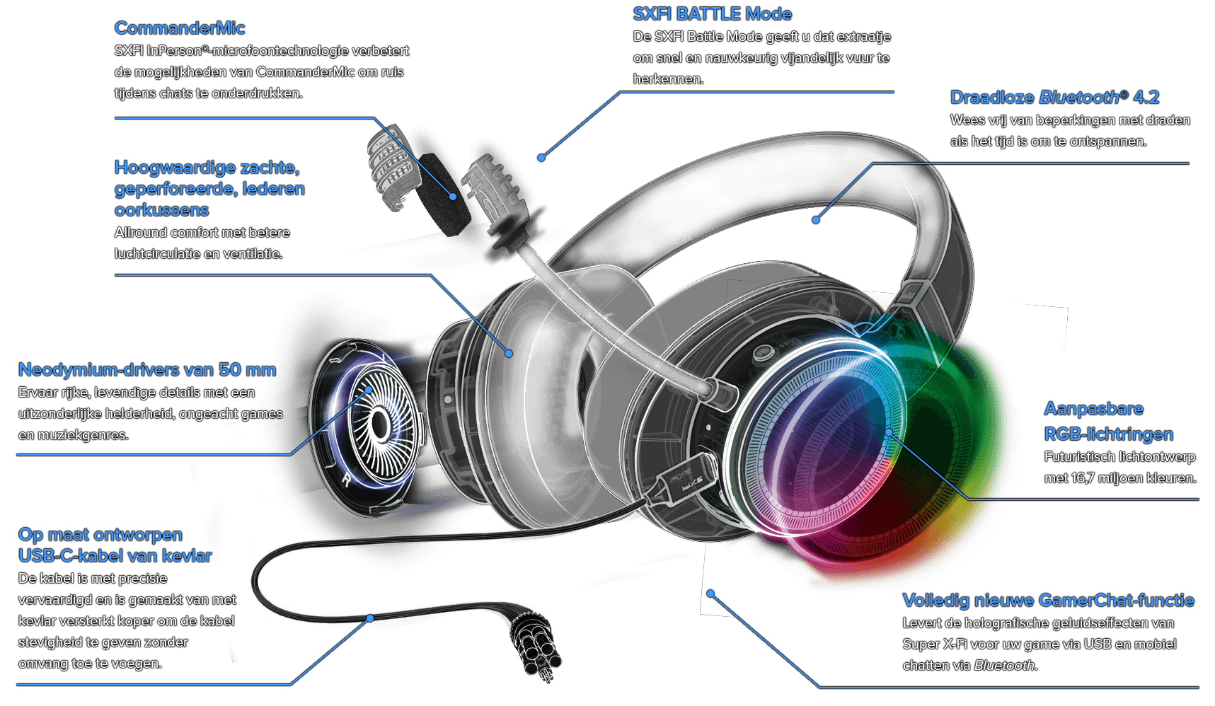 Maak kennis met de ultieme hybride Headphone Holography met SXFI AIR GAMER—een veelzijdige bekabelde headset voor games met Bluetooth® 4.2—die u de vrijheid geeft om aan te sluiten op elk compatibel apparaat van uw keuze of om draadloos verbinding te maken om te kunnen genieten van het gepersonaliseerde geluid van Super X-Fi Headphone Holography!